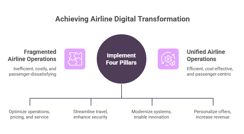Airline digital transformation is the use of technologies like AI, cloud, biometrics, APIs, and connected systems to improve airline operations, customer experience, pricing, maintenance, and revenue generation.