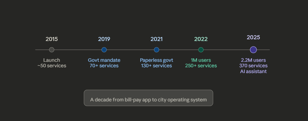 It launched in 2015 with utility bill payments. Then added transport (Salik top-ups, traffic fines). Then progressively more complex services — healthcare, education, property transactions.