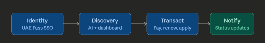 Second, the platform model itself. DubaiNow doesn't just list services from different departments. It transforms department-centric processes into customer-centric ones. A user doesn't think "I need the RTA portal." They think "I need to renew my car." The middleware underneath handles which entity serves what, and it does so invisibly.