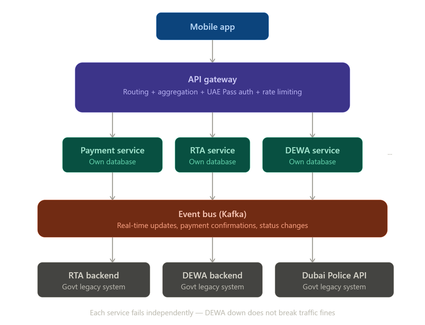 Why this matters: if the DEWA integration goes down for maintenance, traffic fines still work. Health appointments still work. The failure is isolated.
