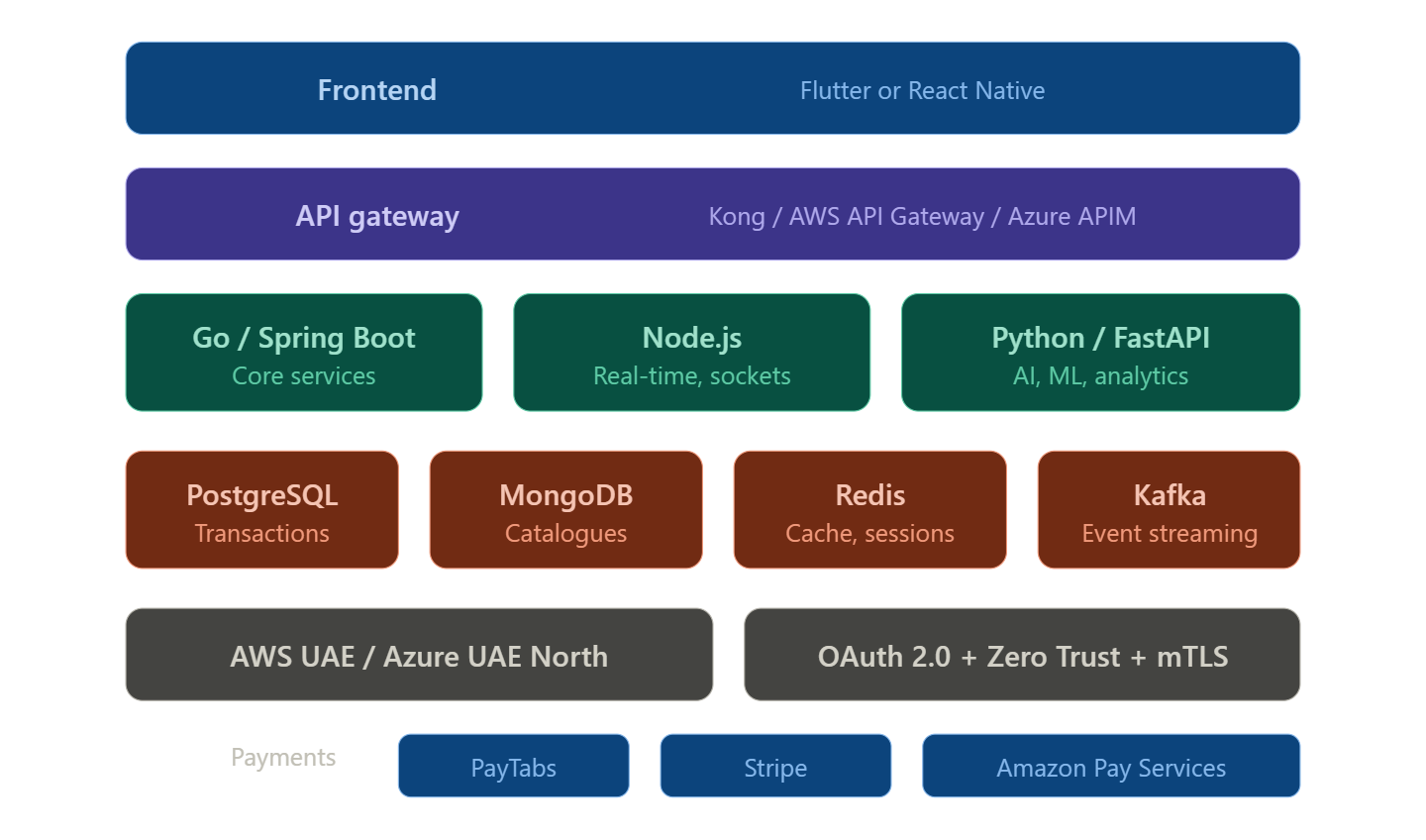 OAuth 2.0 with UAE Pass integration. AES-256 encryption at rest. TLS 1.3 in transit. Biometric authentication. Service mesh (Istio) for mTLS between microservices.