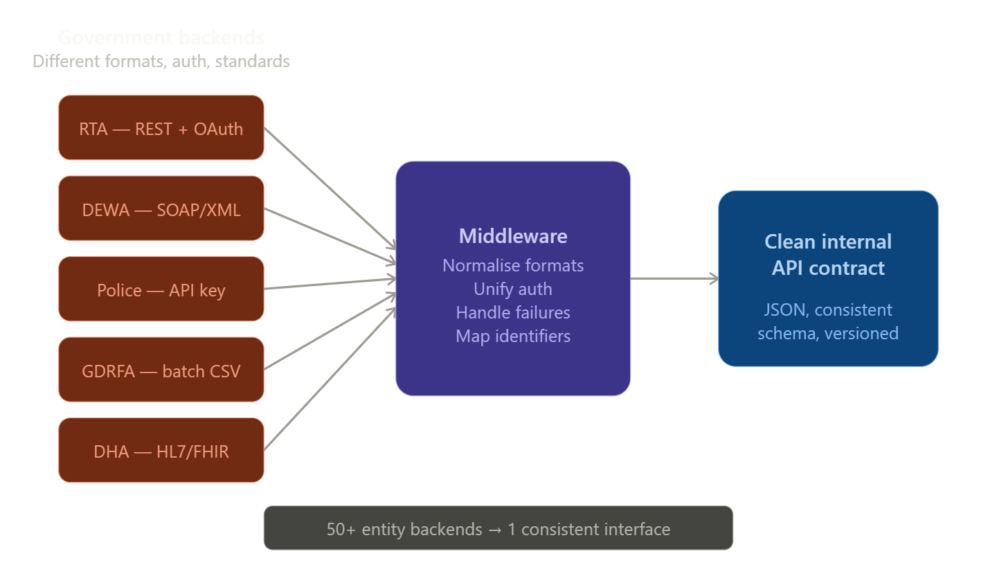 Each entity stores data differently. We see XML here, JSON there, proprietary formats elsewhere. Date formats differ. Arabic text encoding varies. A user's "vehicle" in RTA's system and their "vehicle" in Dubai Police's fines database may use entirely different identifiers.