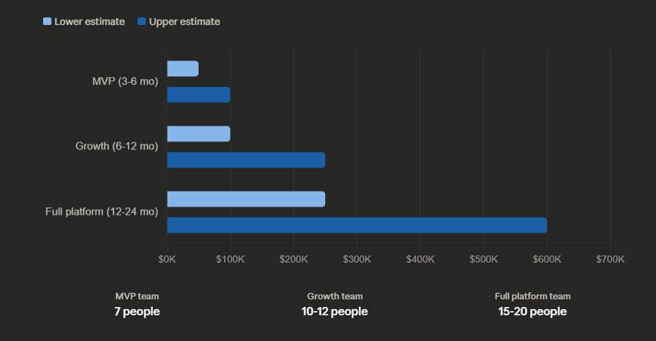Costs vary by scale: an MVP can cost $50,000–$100,000, while a full-featured platform with extensive integrations can exceed $500,000 due to complexity in architecture, compliance, and integrations.