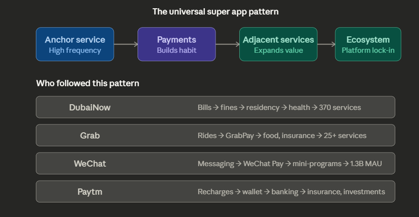 The pattern is universal: one high-frequency anchor service → payments → adjacent services → ecosystem.