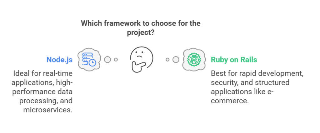 The choice between Node.js and Ruby on Rails depends on your project requirements. If you need a high-performance, scalable application with real-time capabilities, Node.js is the better choice. On the other hand, if you prioritize rapid development, security, and structured coding, Ruby on Rails is the ideal framework.