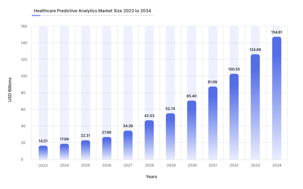 According to some projections the CAGR of the predictive analytics industry withing the Healthcare vertical is set to be 24% form the year 2024 to 2034. These projections say that the market size of predictive analytics was worth USD 17.99 Billion in year 2024 but by the year 2034 the market cap of the predictive analytics industry is supposed to be set to USD 154.61 Billion.