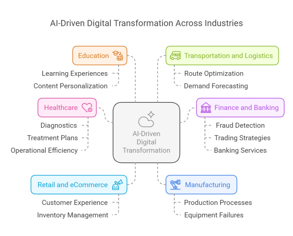The education sector is undergoing digital transformation using AI to enhance learning experiences. AI-powered adaptive learning platforms personalize content based on individual learning styles. AI-driven chatbots assist students with queries, and automated grading systems improve efficiency.
